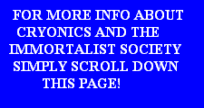 Greetings and welcome to the Home Page of the Immortalist Society!! The Immortalist Society is an organization that is dedicated to the concept of cryonics. For more detailed information about cryonics and related topics, click on one of the links at the bottom of the page which can be quickly accessed by clicking here. For more general information, continue to read this page!
